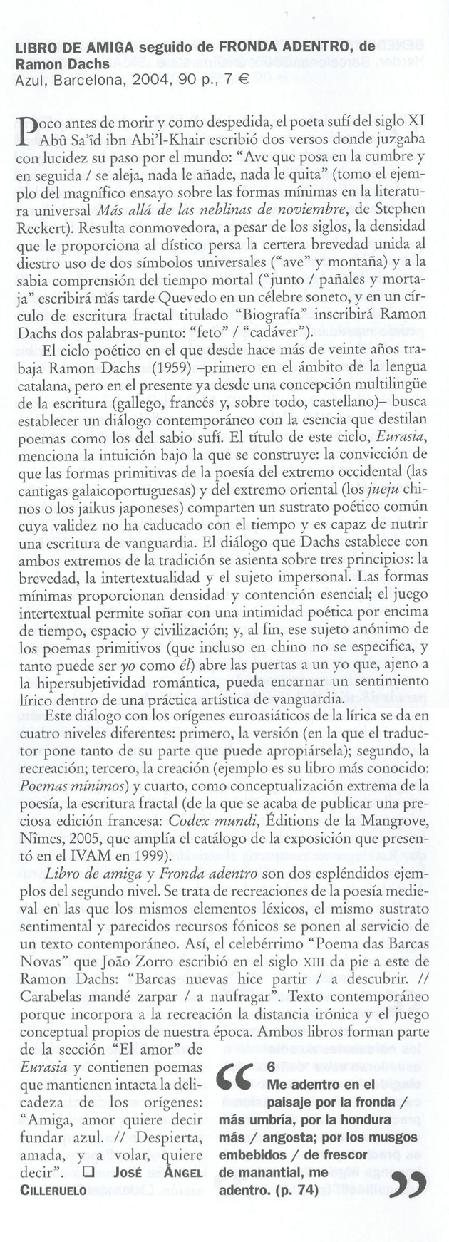 Cilleruelo, José Ángel: “Libro de amiga, seguido de Fronda adentro” El Ciervo (Barcelona, VII-VIII/2005).