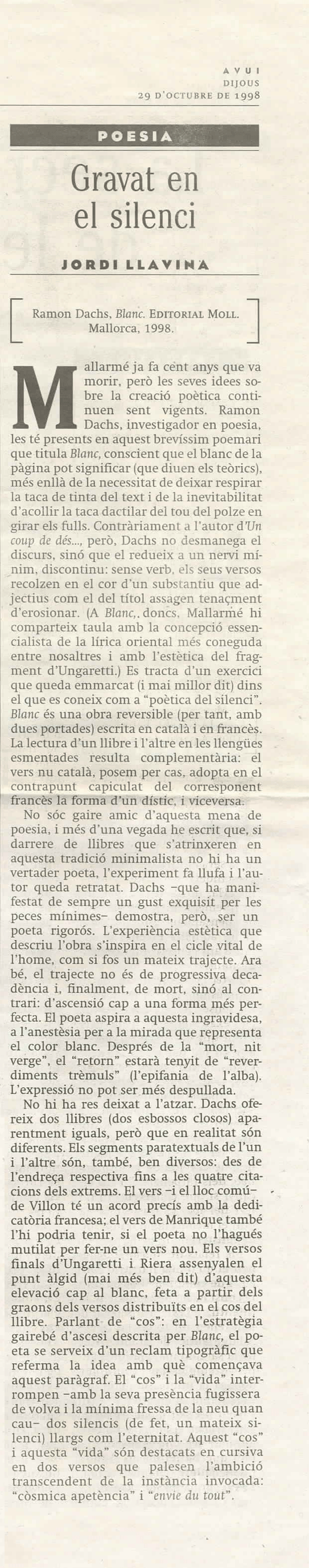 Llavina, Jordi: "Gravat en el silenci" Avui (Barcelona, 29/X/1998)