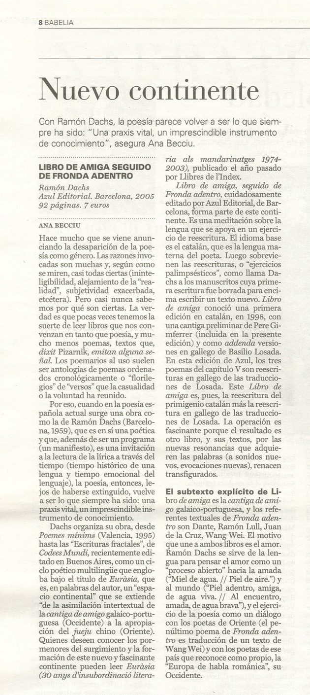Becciu, Ana: “Nuevo continente” El País. Babelia  (Madrid, 27/VIII/2005)