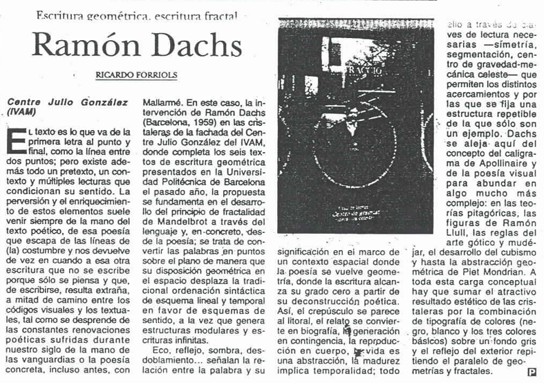 Forriols, Ricardo: “Escritura geométrica, escritura fractal: Ramon Dachs” Levante. Posdata (València, 5/XI/1999)