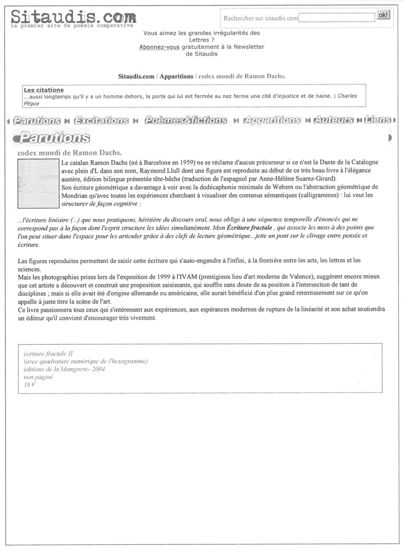 Le Pillouër, Pierre: "Parutions: Codex mundi de R. Dachs" Sitaudis.com (Vallauris, Alpes-Maritimes, VI/2005)