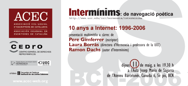 Targetó d’invitació la celebració de 10è aniversari impulsada per Hermeneia-UOC i l’Associació Col•legial d’Escriptors de Catalunya amb motiu de la confecció d’aquesta pàgina (Barcelona: Ateneu Barcelonès, 11/V/2006) Targeta de invitación a la celebración de 10º. aniversario impulsada por Hermeneia-UOC y la Associació Col•legial d’Escriptors de Catalunya con motivo de la realización de esta página (Barcelona: Ateneu Barcelonès, 11/V/2006).
