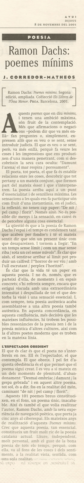 Corredor-Matheos, J.: “Ramon Dachs: poemes mínims” Avui (Barcelona, 8/XI/2001).