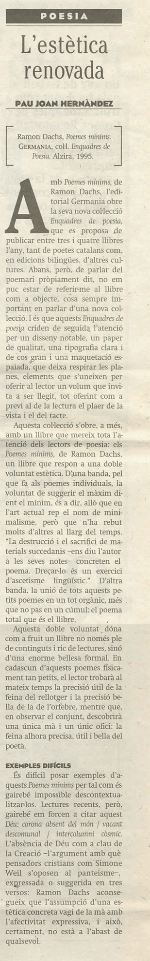 Hernàndez, Pau-Joan: "L'estètica renovada" Avui (Barcelona, 02/XI/1995).