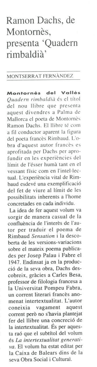 Fernández, Montserrat: "Ramon Dachs, de Montornés, presenta Quadern rimbaldià " El 9 Nou (Granollers, 19/IV/1996).
