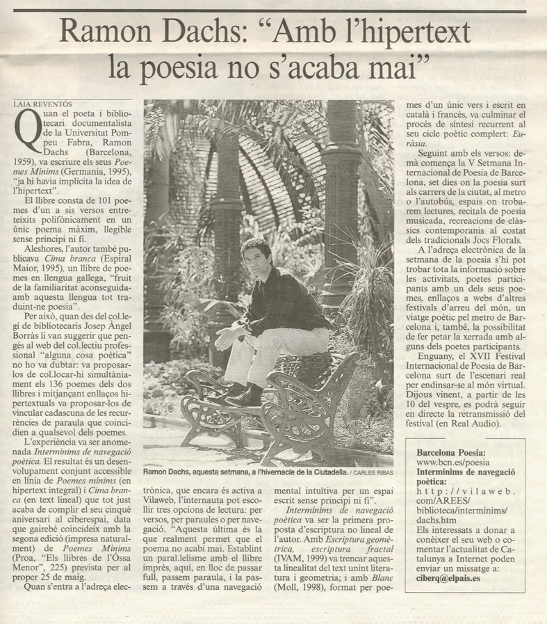 Reventós, Laia: "Ramon Dachs: Amb l'hipertext la poesia no s'acaba mai" El País. Quadern (Barcelona, nº. 931 –17/V/2001–).